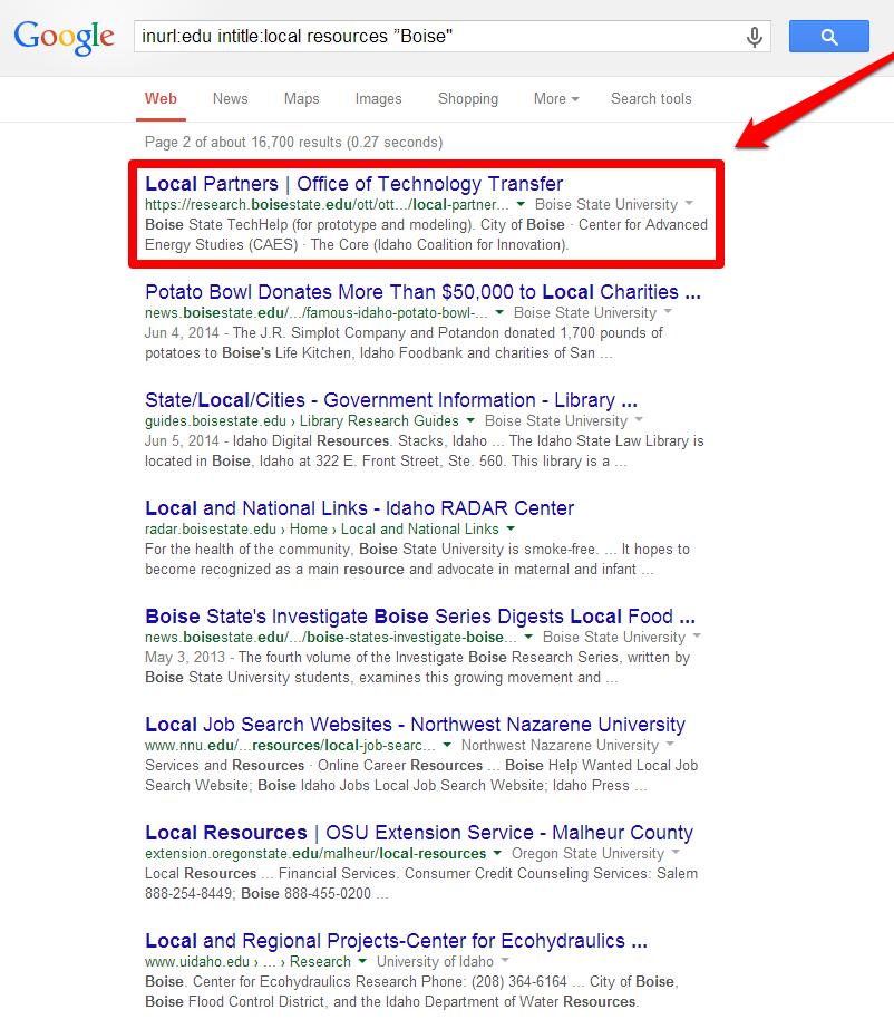 In fact, you could really apply a local angle to any of the strategies listed in this post. Another option is to simply look for local schools with pages dedicated to local businesses. Some options for queries you could use include (for example purposes we will use my hometown of Boise):