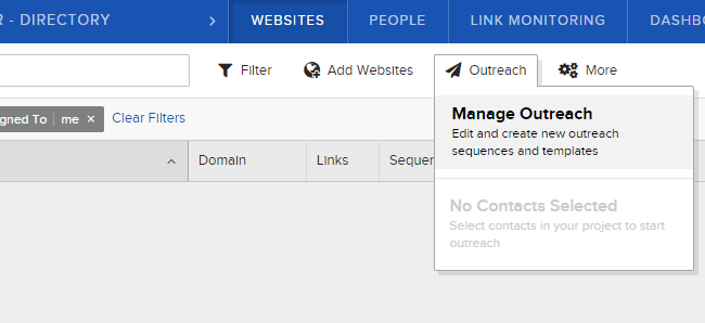 To start, click the “Outreach” button > “Manage Outreach” option from the Websites tab.