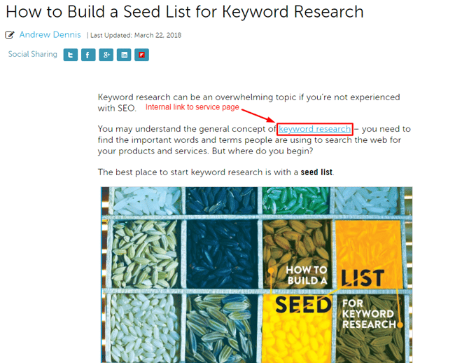This same strategy can be applied to blog posts as well. You just need a link-worthy page that is relevant to your product or service pages, which you likely already have on your blog. Going back to our keyword research example, here is a blog post I wrote about keyword research that internally links to our service page.