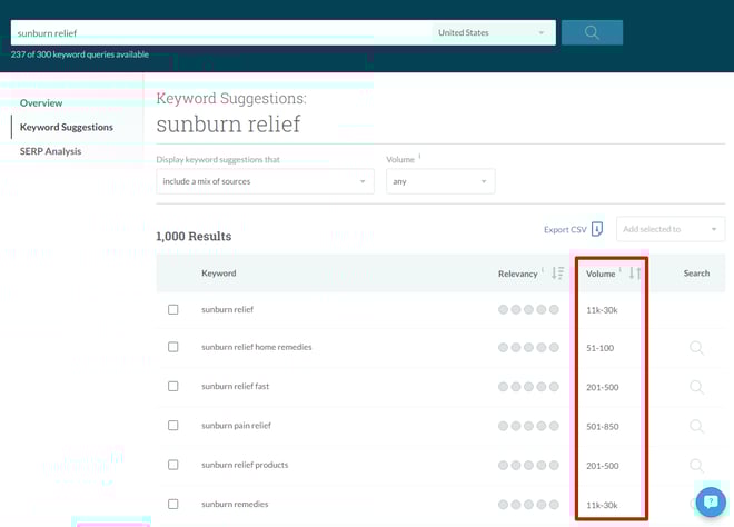 For this tutorial I’ll be researching keyword themes associated with “sunburn relief” (I recently returned from a vacation in Mexico).