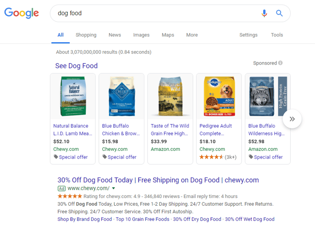 Similar to adwords and sponsored results, shopping results are also paid spots on a SERP. Typically, a shopping result will highlight only specific information, such as a photo of the product, the price, the seller’s information, and potentially a rating or location tag (if the item is located in a physical store and not an online marketplace). When a searcher clicks on the shopping result, they’ll be taken to that product’s page.